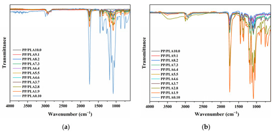 FTIR spectra of PP/PLA blends: (a) before weathering; (b) after weathering for 60 days.