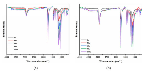 FTIR spectra of blends at different weathering times: (a) PP/PLA8.2; (b) PP/PLA8.2c.