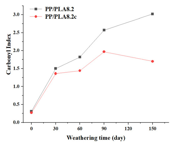 The carbonyl index of PP/PLA8.2 and PP/PLA 8.2c at different weathering times is presented in Figure 3. It is easy to find that both carbonyl index values increase with the increasing weathering time, showing strong evidence of photo-oxidation. The carbonyl index of PP/PLA 8.2 is always more extensive than that of PP/PLA 8.2c, which means that PP/PLA 8.2 has experienced more weathering than PP/PLA 8.2c due to the addition of compatibilizers. This behavior indicates that the addition of compatibilizers has adequate resistance to the degradation of PP/PLA blends. Therefore, we can conclude that compatibilizers can effectively enhance the degradation resistance of the PP/PLA blend.