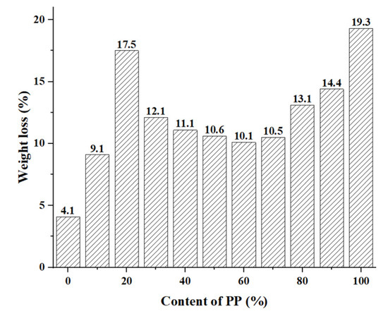 The accelerated weathering test has a remarkable effect on the PP/PLA blends. The weight loss of PP/PLA blends with different compositions after exposure for 60 days is presented in Figure 4. We can see that neat PP (PP/PLA10.0) can quickly photodegrade with the highest weight loss. The tertiary hydrogen atoms in PP chains were susceptible to environmental factors, which can speed up the degradation of PP [20]. Under the accelerating weathering conditions, chain scissions of PLA may be caused by photo-oxidation through UV irradiation and hydrolysis of ester linkages [26]. PLA can absorb water, which causes hydrolysis of ester linkages and leads to the breaking down of long polymer chains. UV irradiation causes the cleavage of the C–O bonds, ester bonds, and C–C bonds in the main chains of PLA. Hence, a certain degree of weight loss is observed in Figure 4. We can see that the weight loss of neat PLA (PP/PLA0.10) is considerably lower than that of neat PP. When we blend these two polymers, we can easily speculate that the weight loss of PP/ PLA blends with different compositions is lower than PP and higher than PLA, as we observed. PP-rich and PLA-rich blends have higher weight loss, and this result is consistent with FTIR result.
