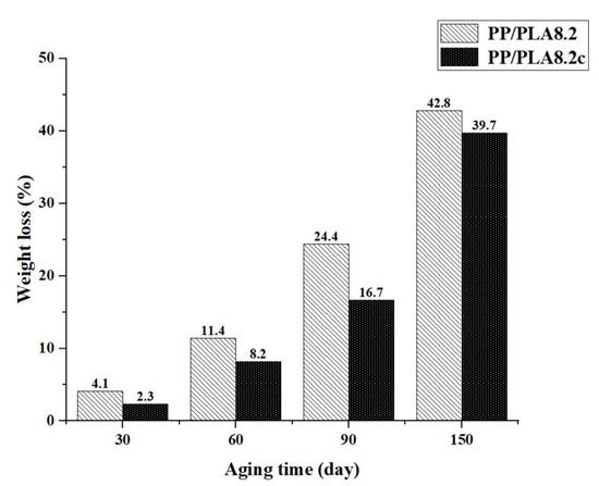 Weight loss of PP/PLA8.2 and PP/PLA8.2c after being exposed at different times.