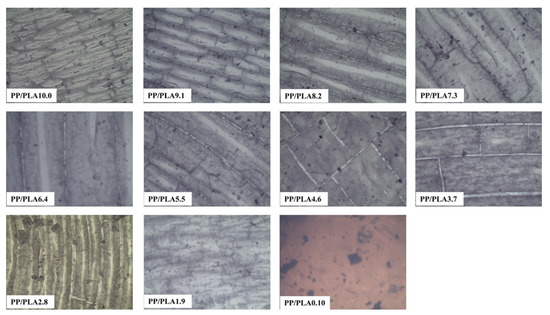 Optical microscopy photographs (×40 magnification) of PP/PLA blends after weathering for 60 days.
