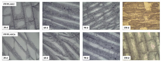 Optical microscopy photographs (×40 magnification) of PP/PLA8.2 and PP/PLA8.2c after different weathering times.