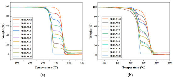 TGA analysis was conducted to estimate the impacts of weathering on the thermal stabilities of all PP/PLA blends. Figure 8a shows the thermogravimetric curves of all PP/PLA blends before accelerated weathering. The curve of the original PP shows a single-stage degradation with mass loss at 358.7 °C–474.5 °C and remains at 1.17% ash. The original PLA also undergoes a process of degradation with mass loss at 308.9 °C–386.3 °C and stays at 1.89% ash. The curves of PP/PLA blends show two-stage degradation, which is attributed to PP and PLA due to the immiscibility between the two polymers [14].