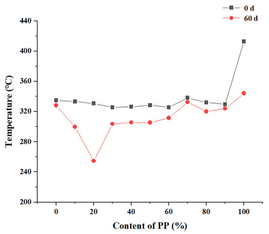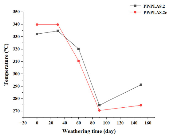 Ti values of PP/PLA8.2 and PP/PLA8.2c with weathering time are presented in Figure 11. The Ti value of the PP/PLA8.2 blend is 332.2 °C. The addition of the compatibilizers improves thermal stability up to 339.8 °C because of the improvement of compatibility. Perhaps because the compatibilizers begin degradation, the Ti value of the PP/PLA8.2c is lower than that of PP/PLA8.2 after 60 days.