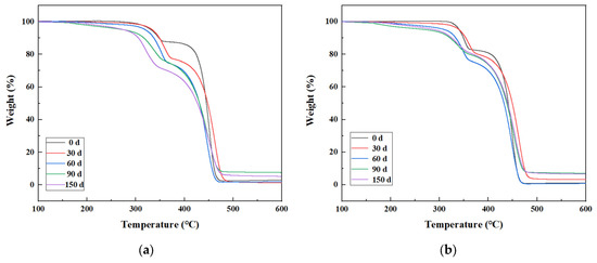 The thermal stability of the samples before and after weathering was analyzed with a NETZSCH5 TG analyzer (Selb, BAV, GER), protected by nitrogen gas with a flow of 20 mL/min, heated from 30 °C to 600 °C at a rate of 10 °C/min, and the curves were recorded [20,21].