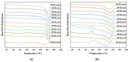where ΔHm(crys) is the melting enthalpy 100% crystallinity, taken as 209 J/g for PP [18] and 93 J/g for PLA [19].