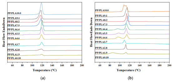 Crystallization curves of the PP/PLA blends: (a) before weathering; (b) after weathering for 60 days.