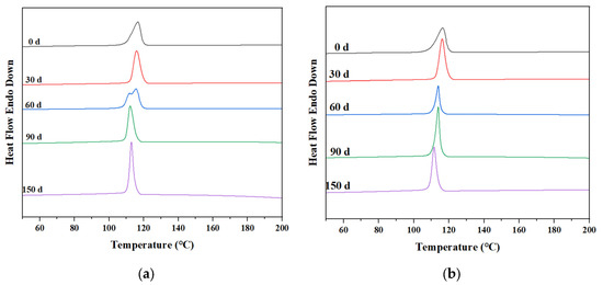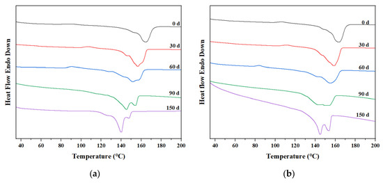 Melting curves of the PP/PLA blends at different weathering times: (a) PP/PLA8.2; (b) PP/PLA8.2c.