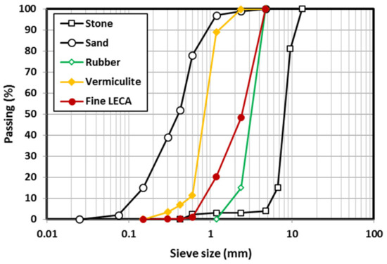 The binder materials used in all mixes were ground granulated blast furnace slag (GGBFS) and fly ash with chemical composition shown in Table 1. According to ASTM C618-15 [27], the summation of SiO2 + Al2O3 + Fe2O3 is more than 70% of fly ash and hence it is classified as Class F. The specific gravities of fly ash and slag were 2.57 and 2.83, respectively. The coarse and fine aggregates used in all mixes were 10 mm dolomite stone and river sand with maximum aggregate size of 4.75 mm, respectively. Three lightweight fine aggregates (rubber, vermiculite, or LECA) were used as partial replacement of GC sand. The aggregate particle sizes ranged between 2.36 mm and 4.75 mm for rubber, 0.3 mm and 2.36 mm for vermiculite, and 0.3 mm and 4.75 mm for LECA. Figure 1 shows the particle size distribution for all aggregates used in this study. The unit weight, specific gravity, and fineness modulus were 1590 kg/m3, 2.71, and 7.89, respectively for dolomite; 1420 kg/m3, 2.61, and 2.20, respectively for sand; 530 kg/m3, 0.97, and 4.85, respectively for rubber; 80 kg/m3, 0.24, and 2.97, respectively for vermiculite; and 880 kg/m3, 1.7, and 4.3, respectively for LECA. High range water reducer (superplasticizer—SP) and retarder with respective specific gravities of 1.085 and 1.057 were used in this study. A mix of sodium silicate (SS) and sodium hydroxide (SH) solutions was used as the activator in the GC mixes. The specific gravity of the alkaline solution was 1.28 and the mixing ratio of SS:SH was 1.7:1.0 by weight. The prepared 12 M sodium hydroxide solution was left to cool down for 2 h and then mixed with sodium silicate solution for 30 min using a mechanical liquid stirrer. The activator was left to cool down to room temperature for 24 h before use in the concrete mixing.