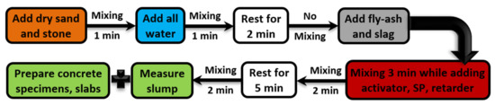 The mixing procedure was as follows: mix dry sand and stone for 1 min.; add all water and mix for 1 min.; rest for 2 min.; add fly ash and slag and mix while adding the activator, superplasticizer, and retarder in 3 min and mix for additional 2 min. when all materials are in; rest for 5 min.; and mix for the final 2 min. It was observed that the GC appeared flowable after adding all materials and mixing for additional 2 min.; however, that flowability quickly decreased within 5 min. This was the reason for leaving the mixes for 5 min. to rest and then mixing them again before measuring the fresh concrete properties and filling the prepared moulds. Figure 2 summarizes the mixing procedure used in this experimental study.