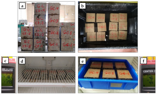 The freezing-thawing effect and the impact resistance were measured for mixes GC, 60 R, 60 V, and 60 L. The freezing-thawing effect on GC compressive strength was measured according to ASTM C666 (Procedure B) [30] using twelve 100 mm3 concrete cubes. The cubes were cut at 28 days concrete age from three 100 × 100 × 470 mm concrete prisms that were taken from each mix and kept in wet curing all the time until the test day. Half of the prepared cubes per mix were used for the freezing-thawing cycles and the other half were kept as control specimens. Three sets of freezing-thawing cycles (10, 20, and 30 cycles) were applied with a 4 hrs period each full cycle. For each freezing-thawing cycle, the specimens were picked up from the curing water and their surfaces were dried using a piece of cloth, then they were inserted in a freezer with a temperature of −18 °C for 2 h (freezing time). The specimens were then fully surrounded by water in a container and moved to a fridge with a temperature of 4 °C for 2 hrs (thawing time). At the end of each cycle set, the compressive strength was measured using two cubes and compared with another two control cubes that were left in clean tap water from after the 28 days until the end of each cycle set (test day). Figure 3 shows the details of the prepared freezing-thawing test specimens and procedures.