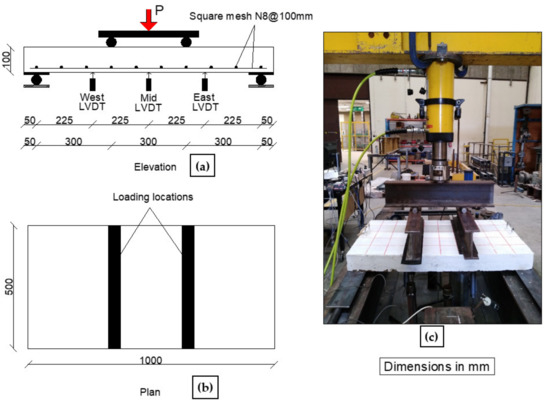 The reinforced slabs were cast in wooden moulds and left for 48 h before de-moulding and were then cured for 28 days in a water bath. White paint and grids were applied on the slabs to facilitate observation of cracks, see Figure 5. The slabs were tested under 4-point bending monotonic load using a hydraulic jack (600 kN capacity and 150 mm stroke) with 5 kN/min loading rate. The slabs were instrumented with 3 linear variable differential transformers (LVDT) to measure the deflection at several locations. One LVDT was located at the beam mid-span (450 mm from beam supports) and another two LVDTs were located at 225 mm from the beam supports (West and East LVDTs). The load was measured using a 500 kN loading cell. A data acquisition system (HBM Quantum-X MX1615, made in Germany) and LABVIEW 8.6 [33] were used in controlling and recording the measurements of the tested slabs.