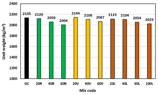 Figure 7 shows the measured average unit weight for all geopolymer concrete mixes. As expected, by increasing the lightweight material content in the geopolymer concrete mix, the mix unit weight decreased. Replacing up to 60% of geopolymer concrete sand decreased the concrete unit weight by 6%, 3%, 4% for rubber, vermiculite, and LECA, respectively. Although the vermiculite is the lightest material used in this study, it showed the lowest ability to reduce the geopolymer concrete unit weight. This can be attributed to its highly compressible nature that could allow the dolomite stone to squeeze or crush its particles within the concrete matrix and marginalize its effect [36]. Complete replacement of geopolymer concrete sand by LECA decreased the unit weight by 5% compared to the control GC mix.
