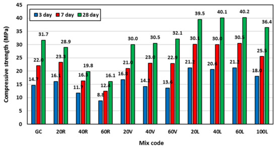 - GC compressive strength increased when using 20% rubber content but decreased beyond that. Regardless of the vermiculite content, it showed scattered effect on the GC compressive strength. LECA showed significant increase in GC compressive strength by up to 44%, 39%, and 27% at 3, 7, and 28 days, respectively.