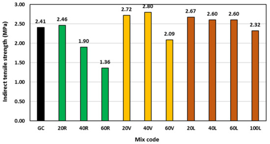 The 28 day indirect tensile strength was determined and plotted in Figure 9. Up to 20% rubber content, there was no obvious influence on the tensile strength compared with the corresponding GC mix. Beyond that, the tensile strength started to decrease. Replacing 40% and 60% of geopolymer concrete sand by rubber decreased the indirect tensile strength by 21% and 40%, respectively. At low rubber content, the rubber particles might be able to bridge the cracks under loading which overcame the expected tensile strength reduction corresponding to the reduction in compressive strength. With increasing rubber content, the number of weak points within the concrete matrix became more pronounced due to the poor adhesion between rubber and binder, and hence leading to easier cracking under tensile stresses [38].