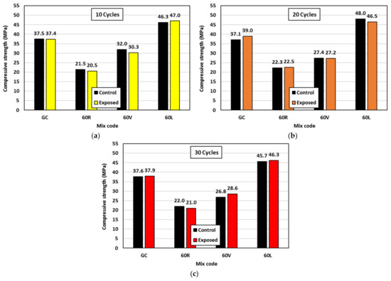 The durability of geopolymer concrete was measured by exposing 100 mm3 concrete cubes to freezing-thawing cycles [30]. This was conducted on mixes GC, 60 R, 60 V, and 60 L. The compressive strength of the exposed cubes to the freezing-thawing cycles (after 10, 20, and 30 cycles) was compared with that of control cubes taken from the same mixes, see Figure 10. As can be observed from the results, there was no significant effect on the compressive strength up to the maximum applied number of freezing-thawing cycles (30 cycles). It is recommended to test geopolymer concrete with lightweight fine aggregate under a higher number of cycles for better investigation of that effect.