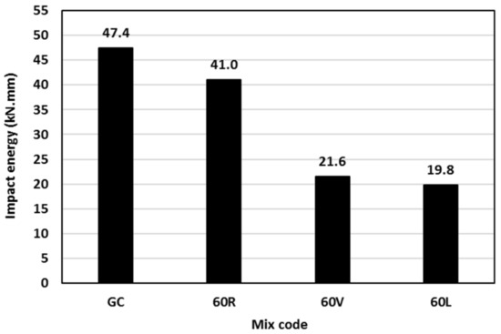 The geopolymer concrete impact resistance was measured for mixes GC, 60 R, 60 V, and 60 L through a drop weight impact test using ten discs from each mix [31]. The results of the tested mixes are shown in Figure 11. Regardless of the lightweight fine aggregate type used, the impact resistance of geopolymer concrete mixes decreased when replacing 60% of the sand volume. The geopolymer concrete with rubber showed only 13% decrease in the impact resistance although its corresponding compressive strength decreased by 50%, as shown in Figure 8. This is unlike the rubber performance in Portland cement concrete in which the impact resistance increases with the rubber content increase [40]. The geopolymer concrete with vermiculite or LECA behaved similarly in that they showed about 57% decrease in the impact resistance compared with that of mix GC, although their compressive strengths were even higher than that of the control mix GC. The results indicated that the rubber was able to show sustainable impact resistance when used in geopolymer concrete compared with other lightweight fine materials. This could be due to the superior toughness and ductility of rubber compared with other materials used, which could work as springs within the concrete matrix [41]. This helped to absorb energy and dissipate it rather than transfer to the surrounding materials and therefore, postpone the initiation of the concrete cracks.