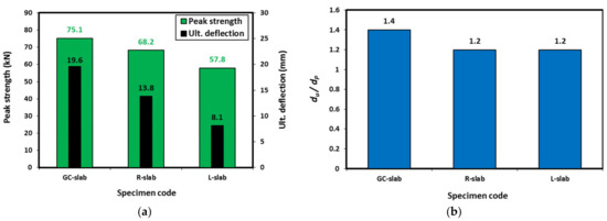 Results of the tested slabs: (a) peak strength and ultimate deflection, and (b) displacement ratio.