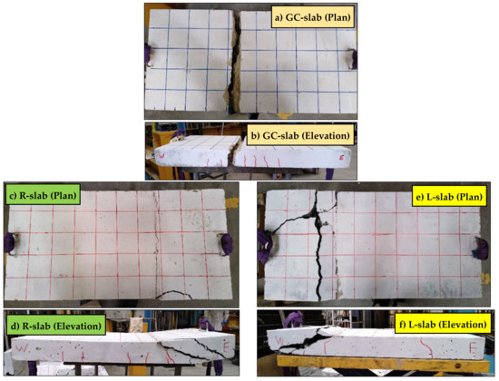 Global damage, crack extension, and failure mode of the tested slab specimens: CC-slab in (a,b), R-slab in (c,d), and L-slab in (e,f).