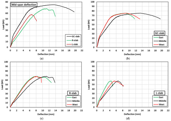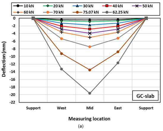 Figure 14 shows the recorded load versus slab deflection at different locations for tested slabs. All slabs showed bilinear behavior connected by a small transition zone. The transition behavior was followed by nonlinear behavior until the end of the test. The transition zone was attributed to the initiation of the cracks in the concrete tension zone that led to a reduction in slab stiffness. The nonlinear behavior was due to the cracking of concrete, crack width increase, spalling of concrete cover, and/or yielding of longitudinal bars. GC-slab specimens were able to resist the load until initial cracks occurred in the concrete tension zone at about 20 kN load and 0.9 mm mid-span deflection, see Figure 14a. This was followed by a reduction in slab stiffness and then the slab was able to resist more load (the load kept increasing) until the slab mid-span deflection approached about 5 mm at a load of 62 kN, where the steel reinforcement started to yield. This caused a rapid increase in the mid-span deflection with slow increase in the load until approaching peak load of 75.1 kN at deflection of 13.5 mm. Then, slab stiffness degradation with load decreasing commenced until a complete rupture of steel reinforcement occurred at the slab’s mid-span, causing failure at 62.2 kN and 19.6 mm.