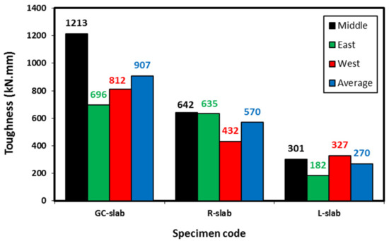The area under the load-deflection curves of each slab specimen has been determined to represent the toughness, shown in Table 4 and plotted in Figure 15. The toughness was determined using the deflections measured at the middle, east, and west of each slab, to represent the effect of slab deformations on toughness at different locations. The average deflection was also used to determine the toughness to compare with that determined at the slab mid-span. For the GC-slab specimen, the measured toughness at slab mid-span was higher than those measured at the slab’s east and west sides. This reflects the failure mode, which was bending failure close to the mid-span of the slab where the largest deflection was recorded and therefore the largest measured toughness. As the failure of the GC-slab occurred close to the slab mid-span from the west side, as shown in Figure 13, the slab showed higher toughness at the west side than at the east side. The calculated average toughness of GC-slab was about 76% of its mid-span toughness.