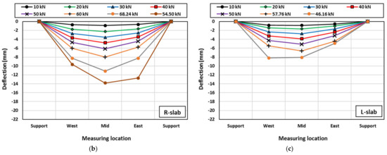 Deflection distribution at each 10 kN for: (a) GC-slab, (b) R-slab, and (c) L-slab.