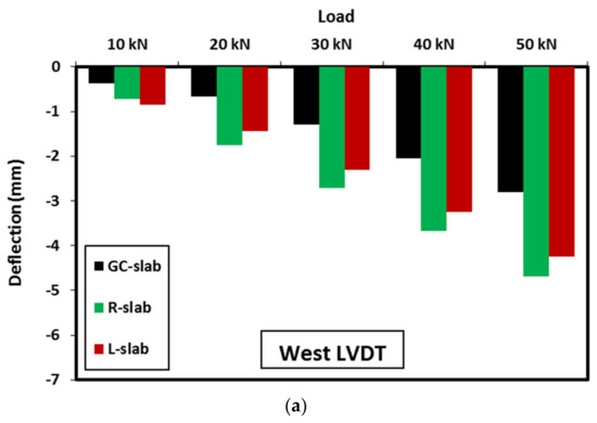 Three LVDTs were used to measure the deflection of each slab at locations named East, Middle, and West as shown in Figure 5. The measured deflection distribution for each 10 kN up to the peak load and at the failure load is shown in Figure 16. As can be observed, with the applied load increase, the slab deflections increased with symmetrical distribution along the slab span up to loads of 70 kN, 68.24 kN, and 40 kN, respectively for GC-slab, R-slab, and L-slab. Beyond those loads, the failure cracks started to initiate, and hence unsymmetrical deflection was observed. Specimens GC-slab and L-slab showed deflections at the west side higher than those at the east side, and vice versa for specimen R-slab. The location of higher deflection had no relationship with the concrete type, but it was more related to initiation and development of the cracks until failure.