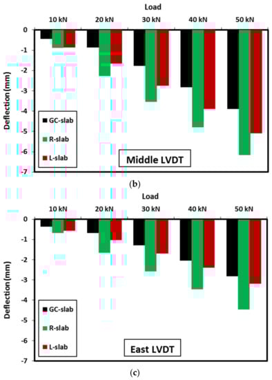 Comparison of slabs deflection at given loads: (a) West, (b) Middle, and (c) East.