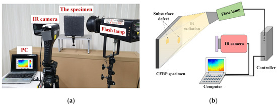 Flash thermographic NDT configurations: (a) experimental set-up; (b) schematic set-up.