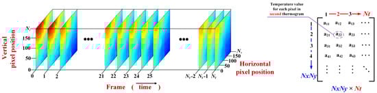 The operation process of each component of the IRT system is described briefly. First, the flash lamp is used as the heat source to emit thermal pulses for heating the specimen. Then, an infrared camera is used to record the surface temperature pattern of the test specimen during the cooling stage. Finally, the captured thermal images are stored on a computer for subsequent analysis. As shown in Figure 2, the temperature pattern is recorded as a hyper-image, which may be viewed as a series of thermograms recorded at Nt sampling instants. Each thermogram is in size. For each pixel, the color indicates the surface temperature at the corresponding location. Each pixel corresponds to a temperature change signal measured at the Nt-th time instant. Moreover, as shown in Figure 2, for most of the thermal image analysis methods, it is necessary to convert the three-dimensional (3D) thermographic data into a 2D matrix by stretching each thermogram into a 1D vector [11,12,13,14].