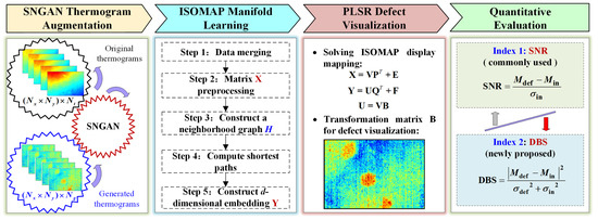 In this section, a deep learning-based GMLT framework is established to facilitate IRT defect assessment. As shown in Figure 3, the framework consists of four parts, including SNGAN-based thermogram augmentation, ISOMAP manifold learning, visualization of defect patterns using PLSR, and quantitative indicators for method evaluation.