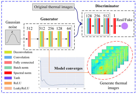 Data augmentation has become one primary method of saving data collection costs to solve small data problems [28,29,30]. For the thermographic data analysis, a critical factor restricting the performance of the thermography method is the limited number of thermal images. Therefore, it is a natural idea to adopt the data augmentation strategy to solve the challenge of the insufficient amount of data faced by thermography methods. Among the data augmentation techniques, thanks to the clever game structure design, GAN and its derivatives perform well in several application scenarios and provide promising solutions [26,27,28,29]. In this work, SNGAN [25], as an improved GAN algorithm, is used as a data augmentation tool to augment the dataset and enrich the diversity of the data.