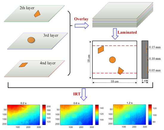 The shapes of defects in real industrial products composed of composite materials are usually irregular and diverse. It is difficult to evaluate these products because the unknown nature of its defects makes it impossible to judge the accuracy of the evaluation results. In this experiment, a CFRP specimen was fabricated using the resin transfer molding process [20]. The 20 carbon fiber sheets and epoxy resin used to form the CFRP specimen had a thickness of roughly 1 cm and a planar size of roughly 18 cm × 18 cm. Three Teflon strips were diamond, circle, and trapezoid., respectively. Each of them had an area of about 3 cm2 and were inserted into the carbon fiber sheets prior to the injection of thermosetting resin into the fiber preforms that had been placed in a closed mold. The deepest defect, which is diamond-shaped, is located under three layers of carbon fiber sheets, the circular defect is located under two layers of fiber sheets, and the trapezoidal defect is located under a single layer. A diagram of the CFRP specimen with defects is shown in Figure 5, where each defect is located in a different plane and at a different depth. This distribution information is used to judge the results of thermographic data analysis methods including GMLT.