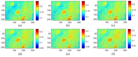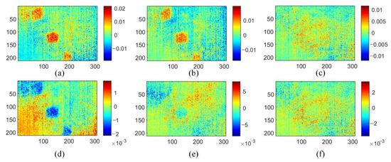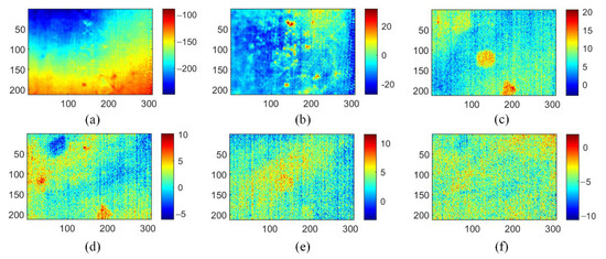 Analysis results of MLT method on three-defective CFRP sample: (a) IV1; (b) IV2; (c) IV3; (d) IV4; (e) IV5; (f) IV6.