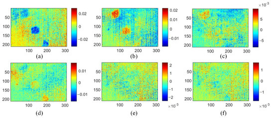 As a representative data dimensionality reduction method, PCA and its extended algorithm have been applied in thermography because of its ability to reduce noise and simple implementation [11]. As shown in Figure 7, six principal component (PCs) images of the PCT method show three types of information including uneven background, noise, and defects. Compared to the original thermograms and the TSR method analysis results, the PCT method obtains better performance for defect detection. PC1 mainly contains an uneven background, while PC3 and PC4 show prefabricated defects, the location of which is clear. However, the contrast between defects and intact areas in the PCT analysis results is not conspicuous for defect identification.
