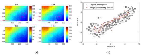 As shown in Figure 9b, t-distributed stochastic neighbor embedding (t-SNE) [33] is used to visualize the distributions of the generated and original data. The marked numbers indicate the order of the original thermograms in the time sequence. It can be observed that the generated images are distributed around the original image in the middle of the sequence. A reasonable explanation is that the denoising and feature extraction ability of SNGAN make it more inclined to generate images similar to the information part of the training images [23]. In the original thermogram sequence, the first few frames contain a lot of noise and an uneven background, the last few frames contain less temperature contrast patterns, and the middle section contains the critical information that is the main object of learning for SNGAN. Therefore, the GMLT method incorporating the SNGAN data augmentation strategy has good defect detection performance.