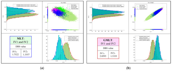 As shown in Figure 11a, the probability density plot of the data in IV1 shows that the data are better separated in that direction than in IV2. The DBS value in the lower left corner of the figure indicates that IV1 is a better projection direction than IV2, and the data can be better separated in this direction. As shown in Figure 7 for the MLT results, the defects of IV1 are indeed clearer than that of IV2. Compared with Figure 11a, the probability density plot of GMLT shown in Figure 11b on the same class of data on the IV1 projection is more distinguished, indicating that the GMLT method can maximize the separation of defect information from other information and achieve better defect detection results. Similarly, Figure 12 shows the advantages of GMLT and the importance of the projection direction with a probability density plot. Figure 12a shows that the MLT method has inferior data separation in both the IV3 and IV4 directions, which corresponds to the undetectable defect information in the IV3 and IV4 thermograms in Figure 8. In contrast, Figure 12b clearly shows that the data are almost inseparable in the IV3 direction of the GMLT, and the data are well separated in the IV4 direction, which is consistent with the defect information detected by IV3 and IV4 in the GMLT result shown in Figure 10.