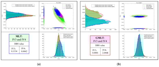 Pixel distribution and respective projections and their probability density plots in IV3 and IV4: (a) MLT; (b) GMLT.