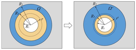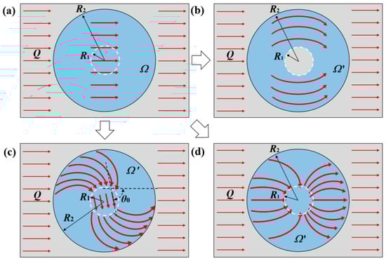 Figure 1a,c depict the plane circular structure spaces before and after the coordinate transformation for designing a thermal rotation meta-structure. The circular spaces marked as Ω and Ω′ are the plane-limited spaces before and after the coordinate transformation, respectively. When the heat flow, Q, enters the coordinate-transformed space, Ω′, the direction of heat-flow transmission rotates by a certain angle of θ0 (Figure 1c). Meanwhile, the heat flow converges to the circular area with a radius of R1 (Figure 1c), so that the angle of θ0 rotates the heat-flow transmission direction in the central circular area.