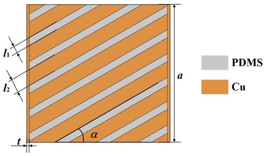 This work introduced a grid geometry form into the square units, as shown in Figure 4. We used PDMS material as one strip element with a width denoted as l1, and copper metal as the other strip element with a width denoted as l2. The stripe-shaped elements of the two materials were staggered and merged into a square unit with a side length denoted as a. The stripe-shaped elements of the square unit had an included angle, denoted as α, with the horizontal direction. To improve the heat transfer efficiency, the copper material edge strips with a width denoted as t were designed on both sides of the square unit. Considering the enhancement in heat transfer efficiency and the feasibility of subsequent fabrication and thermal tests, we determined the geometric parameters: a = 10 mm, l1 = 0.5 mm, l2 = 1 mm, and t = 0.2 mm.