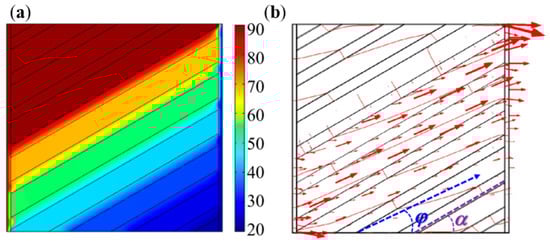 Thermal simulation results for a square unit with α 30°: (a) nephotogram of temperature fields on the surface; (b) heat flow direction with an inclined angle φ.