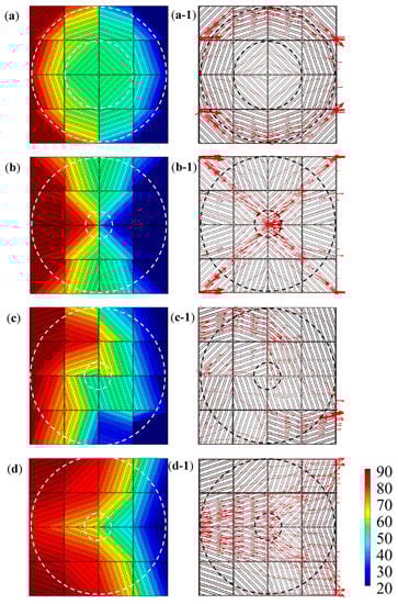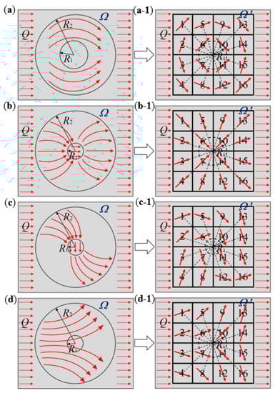 Schematic diagrams of heat-flow transfer directions in the meta-structures of thermal cloak (a,a-1), thermal concentration (b,b-1), thermal rotation (c,c-1), and thermal dispersion (d,d-1), before (a–d) and after (a-1–d-1) spatial discretization to sixteen square unit modules.