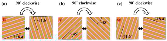 The effectiveness of the meta-structural thermal manipulation functions based on the above-mentioned “jigsaw puzzle” design idea also largely depended on the number of square unit modules per unit area of the meta-structural plane. That is similar to the relationship between the picture and the pixel. That is, the more pixels that make up a picture, the clearer the picture. Theoretically, the more square units in a convertible meta-structure per unit area, the better the thermal manipulation performance. Herein we selected the number of the square unit modules to compose one convertible meta-structure as 16, i.e., 4 × 4, for the design, simulation analyses and verification. As exhibited in Figure 6 and Table 1, through the following different arrangements of the modules, multiple thermal manipulations can be achieved based on the different discrete heat-flow straight directions within the modules. Accordingly, a total of six kinds of square unit modules, with the heat-flow transfer angles of 18.4°, 45°, 71.6°, −18.4°, −45°, and −71.6°, were used for the meta-structures with multiple functions including thermal concentration, thermal cloak, thermal rotation, and thermal dispersion. The orientations of the stripe-shaped elements in the square units roughly equated to the φ values. While the stripe-shaped elements with the inclined angles of −18.4°, −45°, and −71.6° could be acquired by clockwise or counterclockwise rotating 90° of the square units with 71.6°, 45°, and 18.4° angled stripe-shaped elements, respectively. Therefore, the types of the square unit modules constituting the convertible thermal meta-structural devices were simplified into three types: the square units with 18.4°, 45°, and 71.6° angled stripe-shaped elements, respectively shown in Figure 7 and Figure 8.