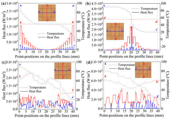 The temperature change curves (dotted lines) and heat flux change curves (solid lines) along selected cross-sectional lines within the thermal cloak (a), thermal concentration (b), thermal rotation (c), and thermal dispersion (d) meta-structures. Note: The blue lines are the changes in temperature and heat flux values along the illustrated transverse sectional lines marked as a-a’ (a), c-c’ (b), e-e’ (c), and g-g’ (d). The red lines are the changes in temperature and heat flux values along the illustrated longitudinal sectional lines marked as b-b’ (a), d-d’ (b), f-f’ (c), and h-h’ (d).