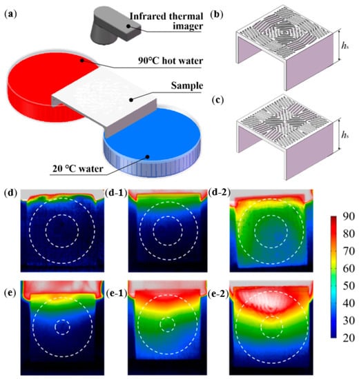 Figure 12a sketches the experimental measurement devices for monitoring the temperature changes on the meta-structural devices. To facilitate heat transfer and thermal testing, two vertical plates with a height, denoted as hs (Figure 12b,c), of 25 mm were printed at both ends of the prepared structure. At the beginning of the thermal test, the heat of 90 °C hot water was gradually transferred from the vertical plate to the plane plate with square unit modules. As the heat flew into the thermal cloak (Figure 12d–d-2) and concentration (Figure 12e–e-2) meta-structural devices gradually increased, the heat flow achieved a steady state when the testing duration went on for 180 s. After the heat-flow transfer was stabilized, the temperature nephogram on the thermal cloak or concentration meta-structures had a high consistency with that simulated by the computer. Thus, the thermal test results of the two meta-structures showed the expected thermal features, verifying the design theory and experimental methods.