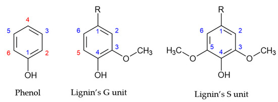Lignin’s monolignol units present a similar structure to that of phenol, as shown in Figure 1. However, the aromatic ring of lignin’s G and S units are blocked in positions 1 and 3, and 1, 3 and 5, respectively. Consequently, lignin units present a lower number of reactive sites, as shown by the red numbers in Figure 1. Therefore, the methoxyl groups are the cause of lignin’s low reactivity. This has hindered the application of lignin in resin synthesis [2,15].