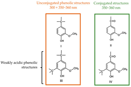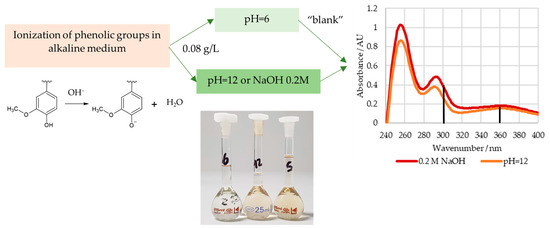The ionization spectra of the analyzed LS samples were found to have two maxima near 300 and 360 nm, which are associated with the structures shown in Figure 3 [39]. The content of weakly acidic types III and IV, , types I and II, , and the total, , phenolic hydroxyl groups were then determined according to Zakis et al. This was carried out considering that the phenolic groups, type I and II, are readily ionized in the alkaline pH 12 solution, whilst the remaining groups require the higher pH of the NaOH 0.2 M solution [39]. A concise scheme with the procedure for this method is shown in Figure 4.