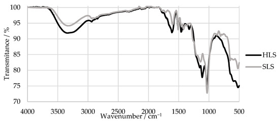 The FTIR spectra of HLS and SLS both presented a peak characteristic of the LS samples near 1034 cm−1 and bands at around 1209 and 644 cm−1, which indicate the presence of sulphonic groups [52,54]. Peaks associated with aromatic ring vibrations at around 1613, 1515, and 1426 cm−1 were also observed in both samples [52]. It can be concluded that, overall, the samples presented similar spectra.