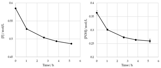 The concentration of the phenolic hydroxyl group types I and II was used for the off-line monitoring of the LS methylolation. Two samples with 0.15 g of the reaction medium were taken every hour for further analysis and diluted in 50 mL volumetric flasks. The determination of the content of the phenolic hydroxyl groups was then carried out, as explained previously [26,39]. It should be noted that this analysis took at least 15 min and that it was observed that the reaction could still progress slowly in the volumetric flasks.